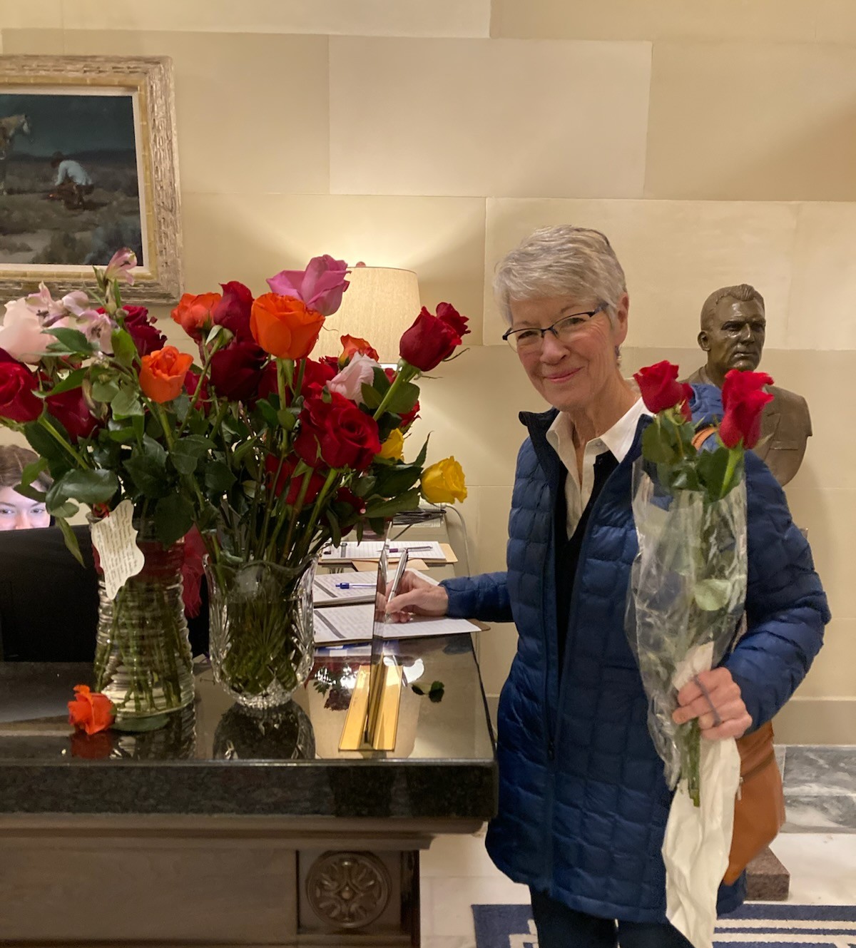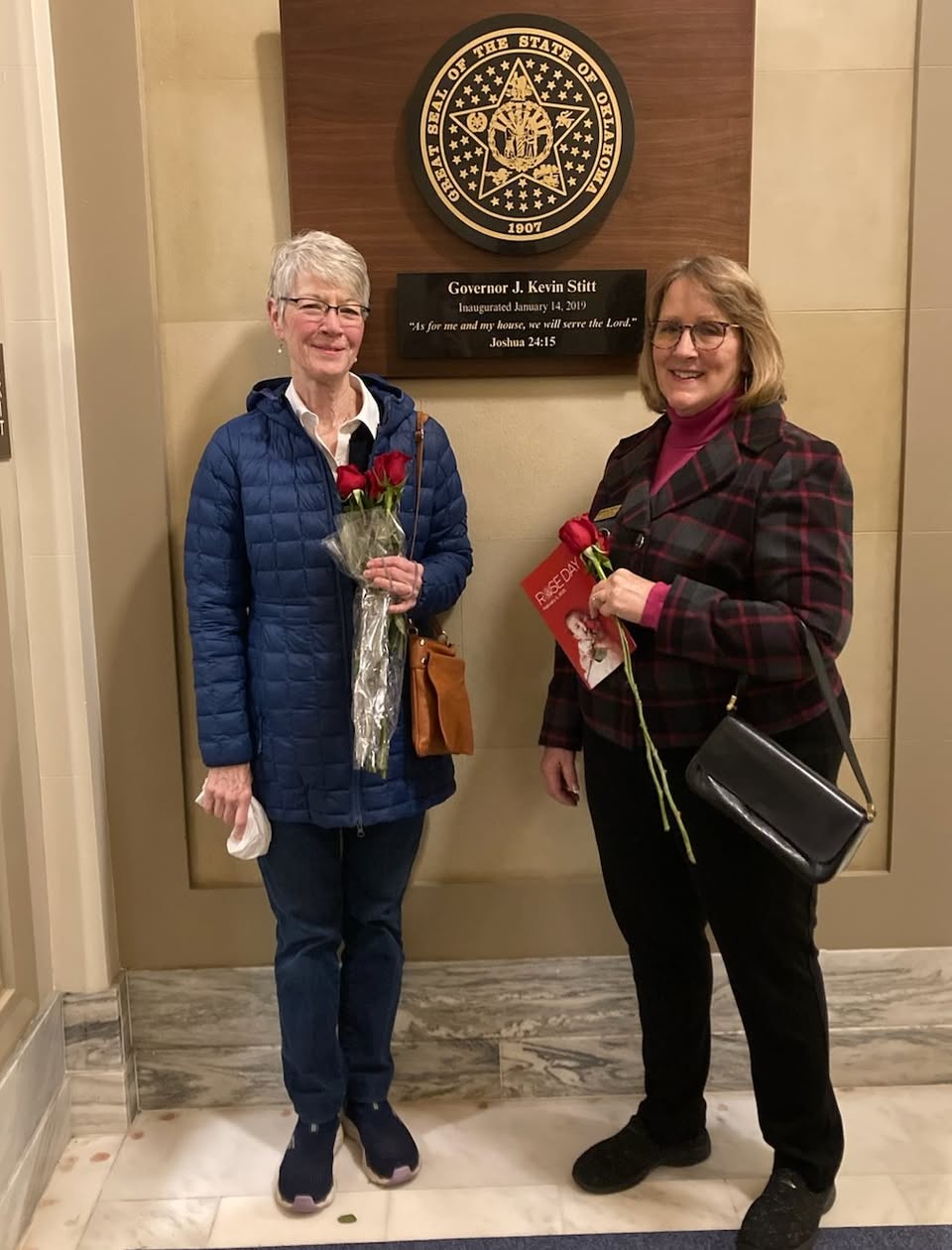 Attending 2025 Rose Day Rally at the State Capital today. Very powerful speaker, Rebecca Kiessling, Attorney and Pro-Life Advocate. Mary Ann Schmitt and Becky VanPool in Governor Stitt’s office.